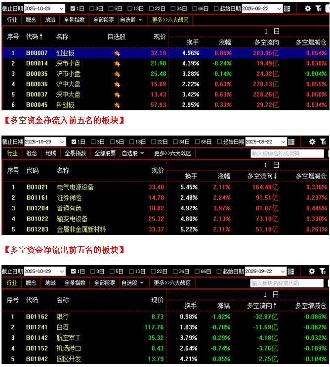 从板块资金动向数据来看,截止到今日收盘时,在资金流入榜上,电气电源设备板块以164.48亿的资金流入额位居榜首;其次是证券保险板块,资金流入91.51亿;此外,普通有色板块、输变电设备板块、金属非金属新材料板块也都相继上榜,三个板块的资金流入额分别为81.07亿、73.10亿、51.18亿;再看资金流出榜,银行板块引领做空,资金流出32.87亿;其次是白酒板块,资金流出11.69亿;此外,航空军工板块、机场港口板块、园区开发板块的资金流出额也都相对较多,分列资金流出榜第三到第五名位置。综合比较后可知,今日不仅证券保险板块与普通有色板块资金流入双双超过80亿,对大盘上行起到推动作用,电气电源设备板块的资金流入额更是高达164亿,同时输变电设备、金属非金属新材料等板块的资金流入额也都在50亿之上,场内热点不断涌现,多方人气继续维持在较高水平,全天资金流入超过10亿的板块多达19个;反观空方阵营,虽然银行板块资金流出超过30亿,同时白酒板块的资金流出额也都在10亿之上,但与多方力量相比,整体抛压仍相对较小。从六大战区的情况分别来看,截止到今日收盘时,六个战区均为资金流入状态,其中不仅创业板战区与深中大盘战区资金流入双双超过200亿,沪中大盘战区的资金流入额更是高达278亿。可见今日各战区都有资金持续进场加仓,且力度依然较强,多方力量继续占据着压倒性优势,说明虽然大盘在4000点附近有所反复,但投资者的做多热情依然较高。在这种情况下,场内的抛压就会被多方快速化解,行情出现连续大幅杀跌的可能性明显降低,后市则有望在资金的推动下继续向上震荡攀升。建议大家在控制好仓位的同时,可关注近期有资金连续流入且股价短期趋势刚刚重新转强的的个股,择机逢低吸纳