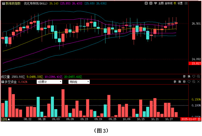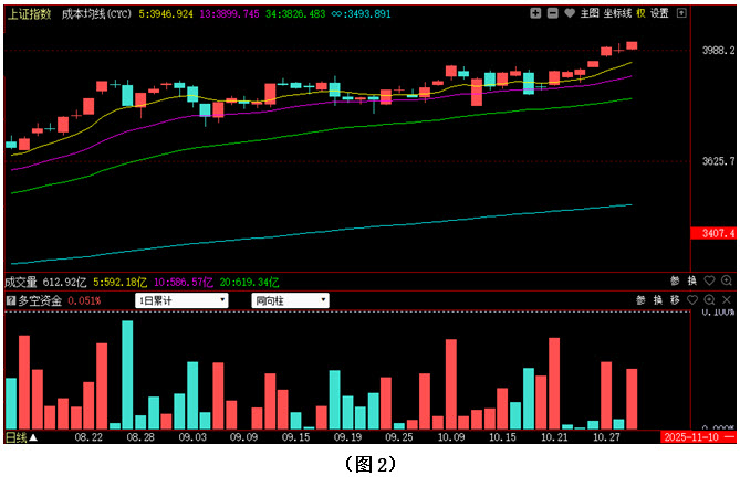 再看图2,今日大盘继续向上攀升,最终以阳线报收。虽然全天涨幅不大,但指数不仅重新跃上了4000点整数关口,而且还再次创出了本轮行情的新高,可见市场短期走势仍处于强势格局当中,后市或有进一步上扬的可能。从下方的多空资金来看,今日多空资金为流入状态,且资金流入量明显超过昨日的资金流出量,说明昨日的抛压已被多方快速化解,并有更多场外资金加入到了做多行列。在这种情况下,行情下方基础就会逐渐夯实,后市则有望在资金的推动下继续向上拓展空间。建议大家密切关注场内多空资金的进出情况以及5日成本均线对大盘的支撑情况,如果多方后续力量依然十分充足,大盘稳步运行在5日成本均线上方,就可坚定持股,继续看多;反之,若是多方后续力量不足,空方连续施压,导致大盘跌破5日成本均线,则需及时降低仓位,谨慎操作。