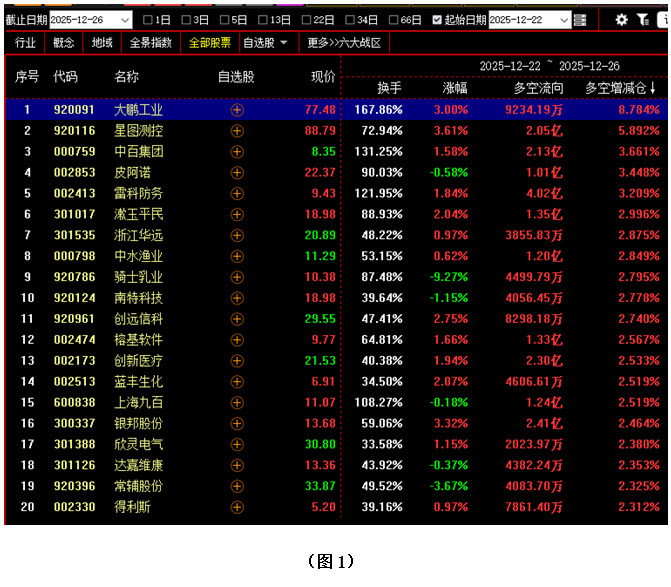 【12月22日至12月26日多空资金增仓前300名中涨幅最小的20只个股】