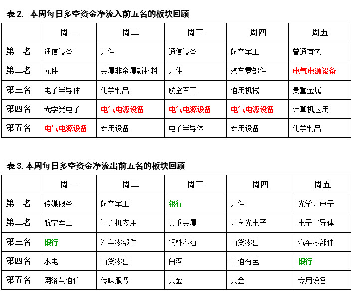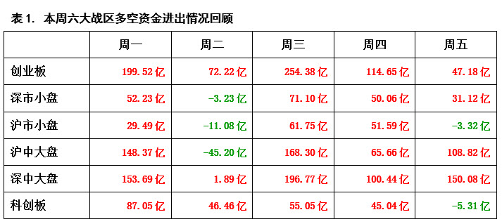 从表1的每日六大战区多空资金进出情况中可以看到,在本周一、周三、以及周四的行情中,六大战区不仅均为资金全面流入状态,而且频频出现单日资金流入额超百亿的战区,说明场外资金进场十分积极;再看周二与周五,虽然空方都曾试图施压,不过空方力量在整体上并未占得优势,所以这两日资金也同样是以流入为主。故此就全周而言,多方优势十分明显。在这种情况下,行情即便出现回探,也很难形成连续大幅杀跌,下周只要多方继续发力,大盘就有望再次向4000点大关发起冲击。