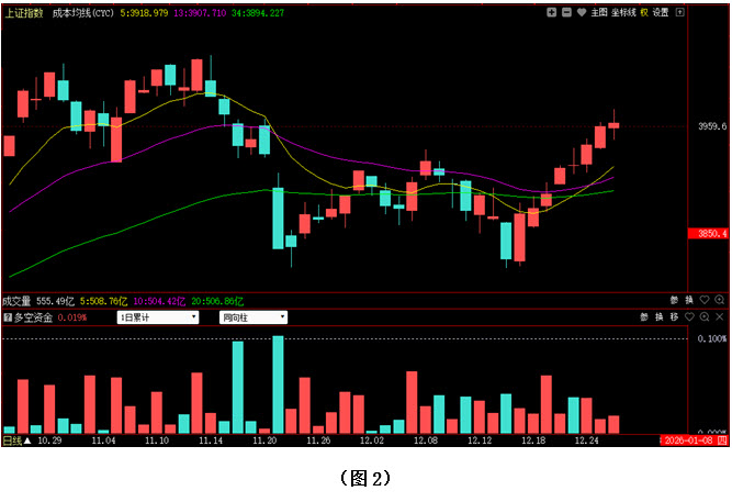 从图2中可以看到,本周一大盘以高开方式直接越过13日成本均线与3900点整数关口,并继续向上回升,市场短期走势得到进一步转强;周二多方向12月8日的3936高点发起冲击,尽管指数冲高回落,未能形成突破,但依然收出了一颗阳十字星;周三大盘并未继续回落,而是再度向12月8日的3936高点发起冲击,且收盘时已站到了3936点的上方;周四与周五指数更是连续向上收出阳线,同时5日成本均线也已上穿13日成本均线形成金叉,市场短期走势极为强劲。从下方的多空资金运行情况来看,本周除周二为资金流出之外,其余四个交易日资金均为流入,由于周三的资金流入量与周二的资金流出量基本相当,所以就全周来说,多方力量显然要强于空方。在这种情况下,即便下周行情出现反复,只要指数保持在5日成本均线上方,市场向上的趋势就不会出现根本改变,而大盘在经过一番震荡整固后,很可能会再次向4000点大关发起冲击。建议大家在控制好仓位的同时,积极优选个股,跟踪观察,待市场出现震荡时,逢低吸纳。