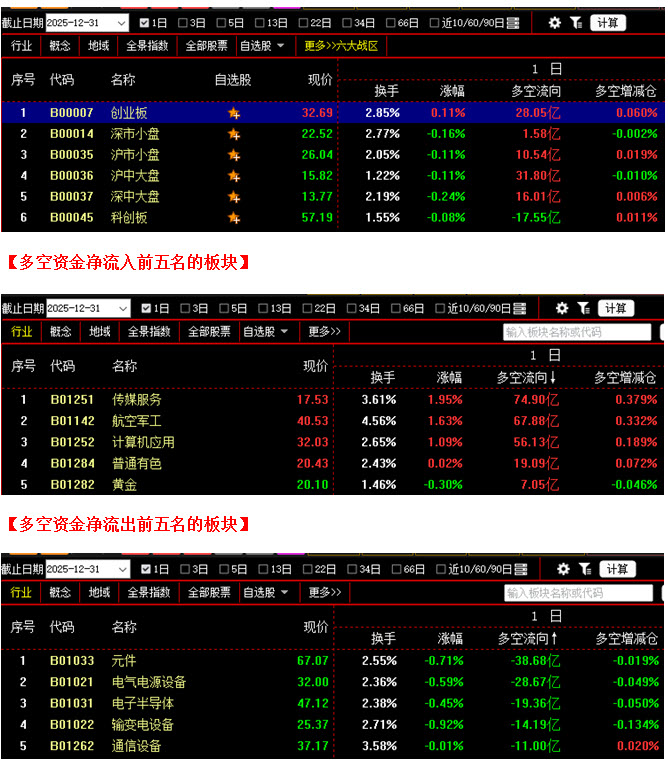 从板块资金动向数据来看,截止到今日午间收盘时,在资金流入榜上,传媒服务板块以74.90亿的资金流入额位居榜首;其次是航天军工板块,资金流入67.88亿;此外,计算机应用板块、普通有色板块、黄金板块也都相继上榜,三个板块的资金流入额分别为56.13亿、19.09亿、7.05亿;再看资金流出榜,元件板块引领做空,资金流出38.68亿;其次是电气电源设备板块,资金流出28.67亿;此外,电子半导体板块、输变电设备板块、通信设备板块的资金流出额也都相对较多,分列资金流出榜第三到第五名位置。综合比较后可知,今日上午不仅传媒服务板块资金流入高达74亿,航空军工板块与计算机应用板块的资金流入额也都在55亿之上,但遗憾的是,其它板块的跟进力度明显偏弱,场内并没有形成群体上攻效应,多方人气难以大幅提升;反观空方阵营,元件板块与电气电源设备板块资金流出双双超过28亿,同时电子半导体、输变电设备、通信设备等板块的资金流出额也都在10亿之上,整体抛压有所增强。可见今日上午多空双方互不相让,争夺十分激烈。在这种情况下,行情既难以大幅上攻,也无法快速回落,市场很可能会继续在3980点下方保持震荡状态,平稳地为2025年全年画上句号,而大盘能否再冲4000点大关的悬念,则留给了2026年来揭晓。建议大家可在控制好仓位的同时,关注近期有资金连续加仓且短期趋势保持向上的优质个股,逢低逐步介入。