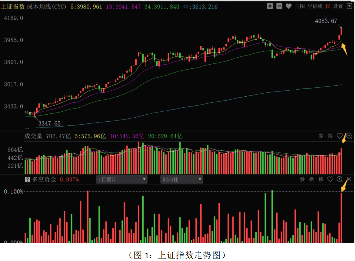 从上证指数走势来看:股指继续强势大涨,收出“13连阳”走势,成交量明显放大,多空资金净流入461.67亿元。虽然盘中股指有所震荡,但是在强劲买盘的推动下,股指以最高点收盘,强势特征明显。节后股指连续强势上攻,技术上对4000点大关和11月平台位置形成有效突破,市场进入4000点时代。板块结构上,有色金属、化工、证券保险等一线、二线蓝筹涨幅居前,商业航天等概念反复活跃,整体市场维持较好的板块演绎结构。在人民币对美元升值,以及“十五五”开局政策落地预期下,股指对4000点有效突破并且伴随着成交量的放大,市场进入新的上涨波段。技术上目前市场上方整体压力较小,可能会在一些整数或半数关口有所震荡。短线走势上,股指连续大涨之后,已经远离中短期成本均线和大幅上穿优化布林线上轨,短线表现出一定的“超买”状态,股指连续大涨做多动能得到集中释放,尤其是连续活跃的证券保险、有色金属等蓝筹方向是大盘向上拓展空间的主线方向,相关板块能否持续活跃需要成交量的持续配合。一旦整体成交量萎缩,股指或有震荡,板块和个股分化走势会显现,会从大阳上攻走势进入震荡缓涨的状态,同时震荡走势中也为资金逢低进场提供了契机。从0Z指数走势来看:股指连续跳空大涨,创出阶段新高,单日多空资金净流入量继续维持千亿级别。板块方面,70个板块中69个板块上涨;个股方面,超4100只个股上涨,市场整体维持较高的赚钱效应。活跃市值强势大涨4.52%,资金整体进场积极性较高,短期压力在10月底平台位置,关注该位置资金的流入持续性,防止短线震荡的可能。从波段结构牛指标组来看:马股比例59%左右,牛股比例逐步回升至24%以上,熊股比例持续下降至16%%。总体上一些低位或调整充分个股处于轮涨阶段,同时部分横盘马股开始小幅向牛股转化。当前操作上可采取稳中有进的应对策略,总仓位控制在七成左右,底仓持股为主,浮动仓位积极把握结构性机会。