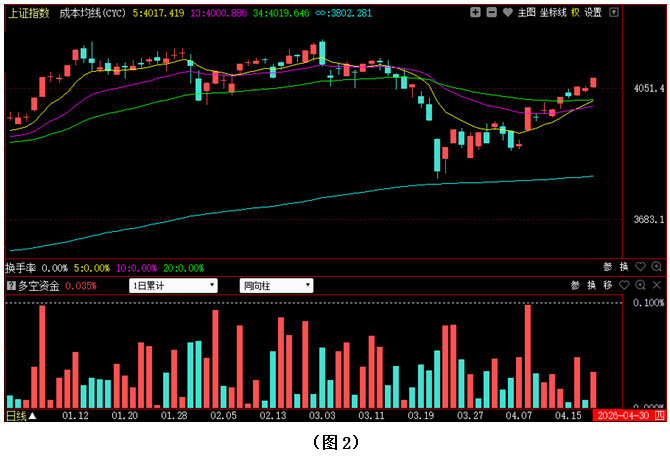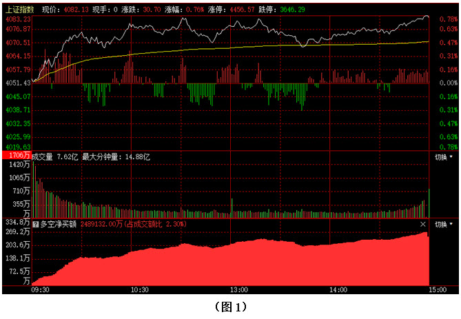 如图1所示,今日早间开盘后不久,大盘就快速拉升至4060点上方,并继续上攻,盘中指数一度冲破4080点,随后市场虽有回探整理,但回探的幅度很小,下午两点半后,大盘再度向4080点上方发起冲击,指数最终以4082点收盘。从下方的多空资金来看,早间开盘后,多方就占据优势,随后资金不断流入,多方优势越来越强。可见今日多方力量依然明显强于空方,资金继续以进场为主,说明虽然近期大盘出现连续向上拉升,但投资者持股信心仍普遍较强,所以目前场内抛压相对较轻。在这种情况下,行情很可能会在资金的推动下继续向上攀升。建议大家可在控制好仓位的同时,可积极关注前期调整较为充分且近期有资金连续加仓的优质个股,择机介入。