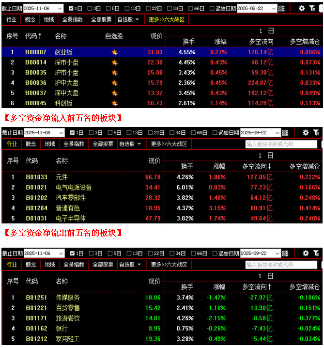 从板块资金动向数据来看,截止到今日收盘时,在资金流入榜上,元件板块以127.05亿的资金流入额位居榜首;其次是电气电源设备板块,资金流入77.23亿;此外,汽车零部件板块、普通有色板块、电子半导体板块也都相继上榜,三个板块的资金流入额分别为64.12亿、60.91亿、49.64亿;再看资金流出榜,传媒服务板块引领做空,资金流出27.97亿;其次是百货零售板块,资金流出13.90亿;此外,旅游餐饮板块、银行板块、家用轻工板块的资金流出额也都相对较多,分列资金流出榜第三到第五名位置。综合比较后可知,今日不仅元件板块资金流入高达127亿,电气电源设备、汽车零部件、普通有色等板块的资金流入额也都在60亿之上,场内热点不断,多方人气进一步提升,全天资金流入超过10亿的板块达到19个;反观空方阵营,虽然传媒服务板块资金流出超过25亿,同时百货零售板块的资金流出额也都在10亿之上,但与多方力量相比,整体抛压仍相对较小。从六大战区的情况分别来看,截止到今日收盘时,六个战区均为资金流入状态,其中不仅创业板战区与深中大盘战区资金流入双双超过170亿,沪中大盘战区的资金流入额更是高达224亿。可见今日多方全面发力,各战区均有资金大幅进场加仓,说明当大盘再次踏上4000点时,投资者的畏惧心理已经较上一次明显减轻,取而代之的则是做多热情持续高涨。在这种情况下,大盘就有望站稳在4000点关口上方,并进一步向上攀升。建议大家在控制好仓位的同时,可关注前期调整较为充分且近期股价短期趋势刚刚重新转强的个股,逢低介入。
