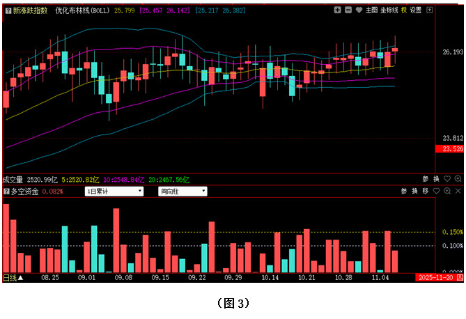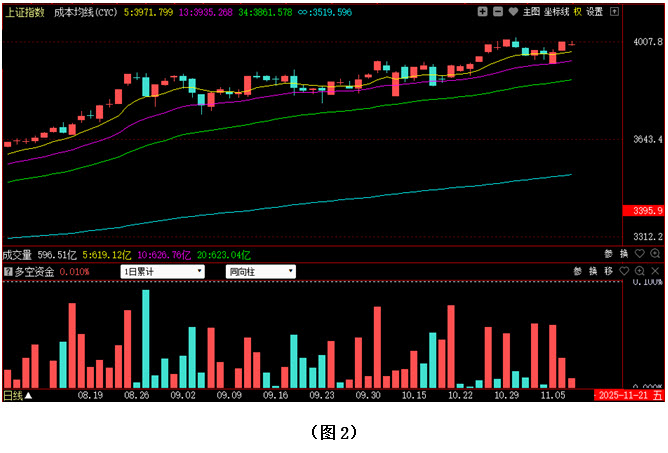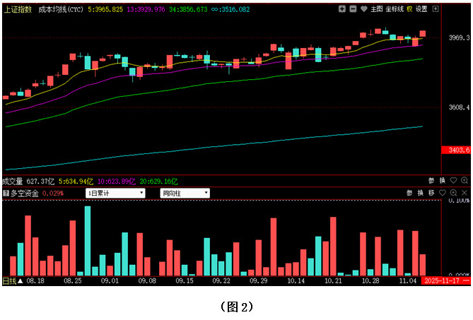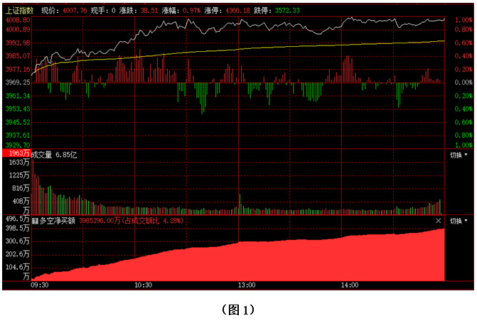 如图1所示,今日早间大盘小幅高开,并一路震荡上行,指数轻松穿越3980点一带的阻力区域,随后再次跃过4000点整数关口,虽然市场在4000点上方没有继续向上大幅拉升,但也没有出现明显回落,午后大盘基本一直保持在4000点之上,进行窄幅震荡整理,指数最终以4007点收盘。从下方的多空资金来看,早间开盘后,多方就占据优势,随后资金持续流入,即便是在4000点上方大盘进行横向震荡的过程中,资金进场的力度也依然在不断加大。可见今日多方进场十分坚决,大盘则在资金的推动下再次站到了4000点整数关口上方。在这种情况下,行情就具备了继续向上挑战的能力。若接下来多方后续力量依然十分充足,大盘很可能会超越10月30日的4025高点,向上创出新高。建议大家在控制好仓位的同时,可关注有资金连续加仓且股价先于大盘创出近期新高的强势个股,逢低择机介入。