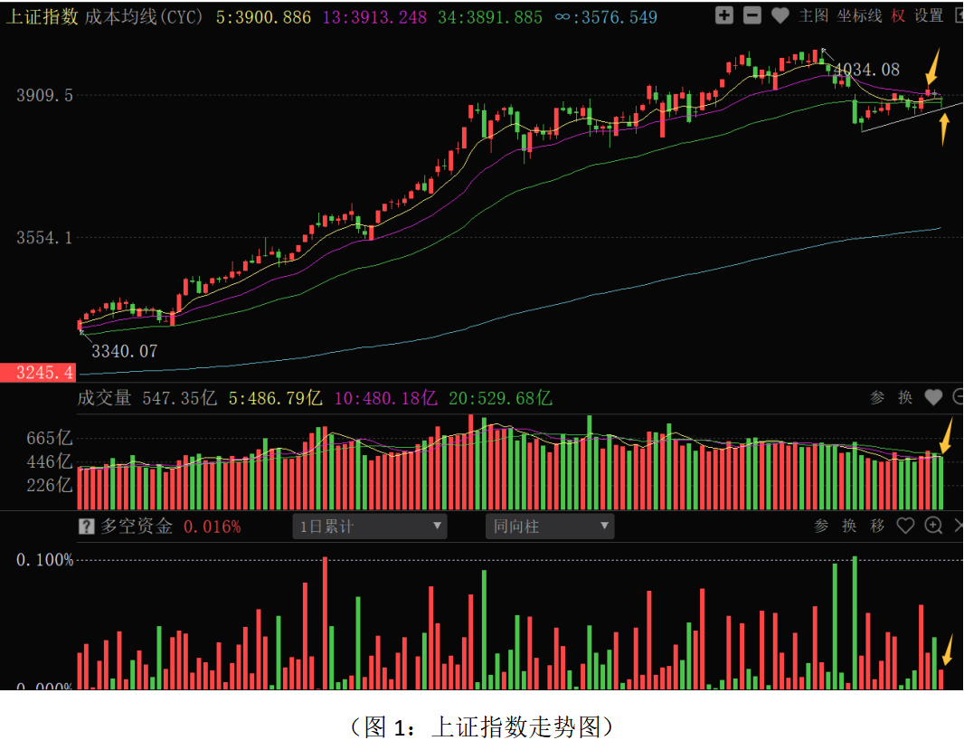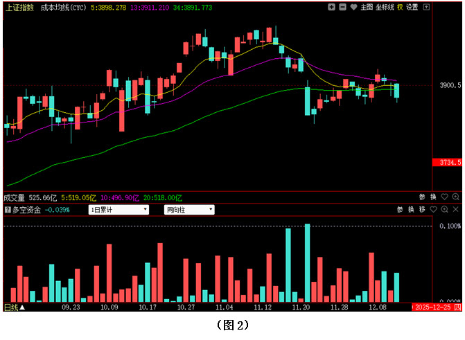 再看图2,今日大盘不仅重新回落到3900点整数关口下方,而且又一次跌破了5日与34日两条重要成本均线,指数不断下探,最终以阴线报收。从下方的多空资金来看,今日多空资金为流出状态,且资金流出量明显超过了昨日的资金流入量,说明多方的后续力量未能及时跟上,而空方则再次加大了施压力度。目前看,经过连续三天的回落,上周五与本周一的两根阳线已被完全吞没,大盘上方再次面临着多条重要成本均线以及3900点整数关口的重重压制。这就意味着市场的短期反弹已经失败,追涨资金多数被套。接下来多方若想再度上攻,不少投资者必然会心有余悸,行情反弹的难度将比上周五大幅增加,所以市场有可能会继续向下回落,到更低的位置去寻求支撑。建议大家在控制好仓位的同时,密切关注多空资金的进出情况,在多方资金没有连续大幅回流之前,不要急于抄底。