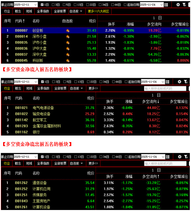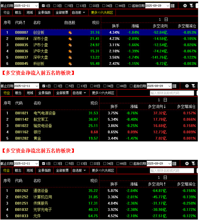 从板块资金动向数据来看,截止到今日收盘时,在资金流入榜上,电气电源设备板块以37.32亿的资金流入额位居榜首;其次是航空军工板块,资金流入17.78亿;此外,输变电设备板块、银行板块、黄金板块的资金流入额也都相对较多,分列资金流入榜第三到第五名位置;再看资金流出榜,通信设备板块引领做空,资金流出64.87亿;其次是计算机应用板块,资金流出45.77亿;此外,传媒服务板块、光学光电子板块、元件板块也都相继上榜,三个板块的资金流出额分别为31.17亿、30.90亿、27.51亿。综合比较后可知,今日不仅通信设备板块资金流出高达64亿,计算机应用、传媒服务、光学光电子、元件等科技类板块也在联手大幅做空,使得场内恐慌性抛盘不断涌出,多方人气快速下降;反观多方阵营,虽然电气电源设备板块资金流入超过35亿,同时输变电设备板块、航空军工板块、以及银行板块的资金流入额也都在10亿之上,但与空方力量相比,整体上攻力度明显不足。从六大战区的情况分别来看,截止到今日收盘时,六个战区均为资金流出状态,其中不仅创业板战区与沪中大盘战区资金流出双双超过50亿,深中大盘战区的资金流出额更是达到141亿。可见今日空方全面施压,各战区均有资金出逃,说明由于大盘迟迟无法形成有力上攻,多方人气已难以聚拢,所以当行情再次回落时,承接盘明显减少。在这种情况下,如果空方连续施压,市场很可能会出现一波加速下探。建议大家控制好仓位,谨慎操作。