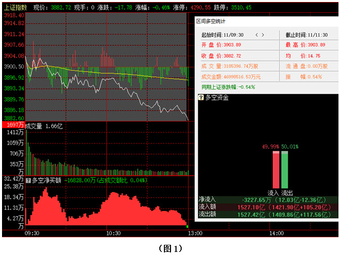如图1所示,今日早间大盘很快就再次跌破3900点整数关口,随后指数逐步震荡下行,多方却迟迟没有进行像样的反击,午后市场表现依然疲软,大盘出现进一步下挫,指数最终以3873点收盘。从下方的多空资金来看,早间开盘后,多方率先占据优势,但资金进场的持续性较差,且随着大盘逐步下探,场内抛压逐渐增大,以致临近中午收盘时,资金出现由红翻绿,午后空方力量更是不断加强。可见今日上午还曾有资金进场试图抄底,但到了下午多方已基本放弃防御,恐慌性抛盘开始不断涌出,导致大盘下跌幅度越来越大。这就意味着,行情在3900点一带经过多次反复之后,最终还是选择了向下。建议大家控制好仓位,同时密切关注3860点附近的支撑情况,若该位置轻易失守,后市很有可能会到3800点附近去寻求支撑。