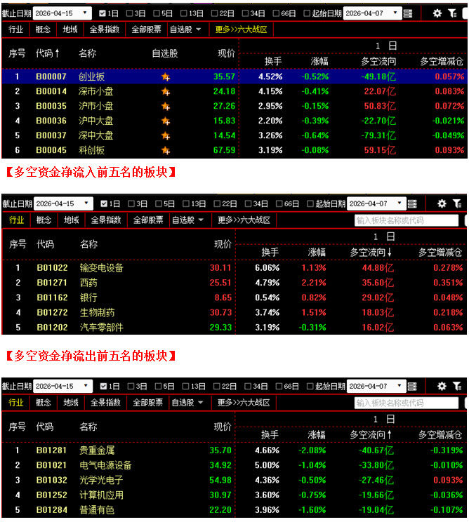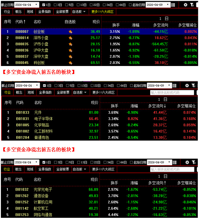 从板块资金动向数据来看,截止到今日收盘时,在资金流入榜上,通信设备板块以165.12亿的资金流入额位居榜首;其次是元件板块,资金流入153.26亿;此外,光学光电子板块、电子半导体板块、计算机应用板块也都相继上榜,三个板块的资金流入额分别为131.91亿、102.12亿、67.99亿;再看资金流出榜,银行板块引领做空,资金流出17.05亿;其次是传媒服务板块,资金流出12.35亿;此外,基础建设板块、航运板块、白酒板块的资金流出额也都相对较多,分列资金流出榜第三到第五名位置。综合比较后可知,今日不仅通信设备板块资金流入高达165亿,元件、光学光电子、电子半导体等板块的资金流入额也都在百亿之上,科技类板块的集体大幅做多使得场内的多方人气进一步提升,全天资金流入超过10亿的板块多达21个;反观空方阵营,虽然银行、传媒服务、基础建设等板块的资金流出额都在10亿之上,但与多方力量相比,整体抛压显然并不是很大。从六大战区的情况分别来看,截止到今日收盘时,六个战区均为资金流入状态,其中不仅沪中大盘战区、深中大盘战区、以及科创板战区资金流入都超过了150亿,创业板战区的资金流入额更是高达299亿。可见今日多方全面发力,各战区均有资金积极进场加仓,场内投资者的做多热情不断高涨。在这种氛围下,即便行情在短期内出现反复,向下的空间也将十分有限,后市则有望在资金的推动下继续向上攀升。建议大家在控制好仓位的同时,积极关注近期有资金连续加仓的优质个股,逢低逐步吸纳。