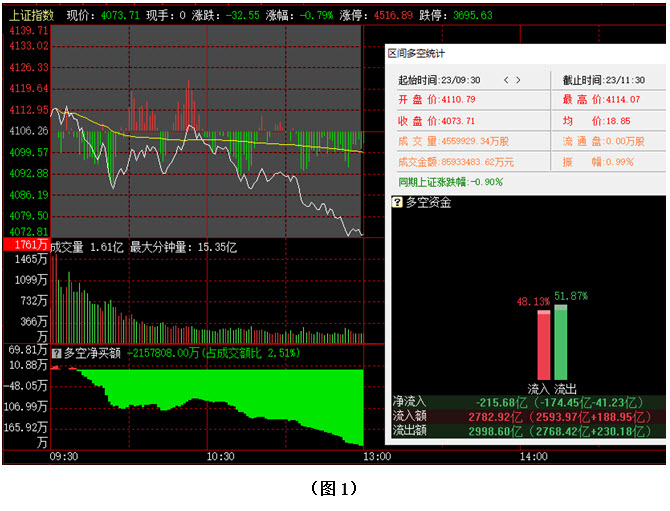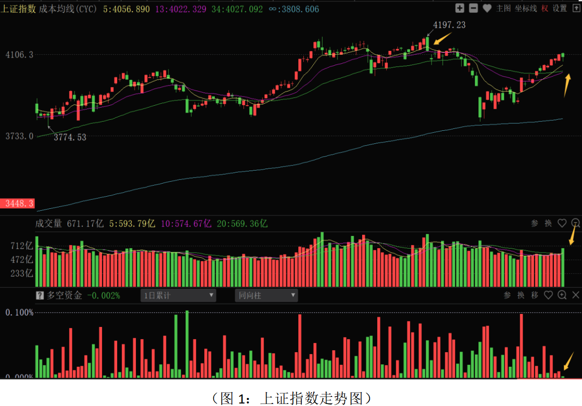 再看图2,今日大盘虽小幅低开,但指数依然完全运行在5日成本均线上方,并进一步上攻,最终夺下4100点整数关口,可见市场短期走势仍处于强势格局当中,接下来只要空方无法连续施压,行情就有望延续现有趋势,继续震荡上行。从下方的多空资金来看,今日多空资金仍为流入状态,且资金流入量较昨日略有增大,说明目前多方力量依然占据着主导地位,但由于大盘刚刚夺回4100整数关口,很多投资者依然较为谨慎,所以资金进场的力度暂时并未大幅增加。在这种情况下,行情在4100点附近很可能还会出现反复,以便确认大盘是否对4100点形成了有效突破。建议大家在控制仓位的同时,密切关注多空资金的进出情况,以便及时掌握行情变化,并做出相应决策。