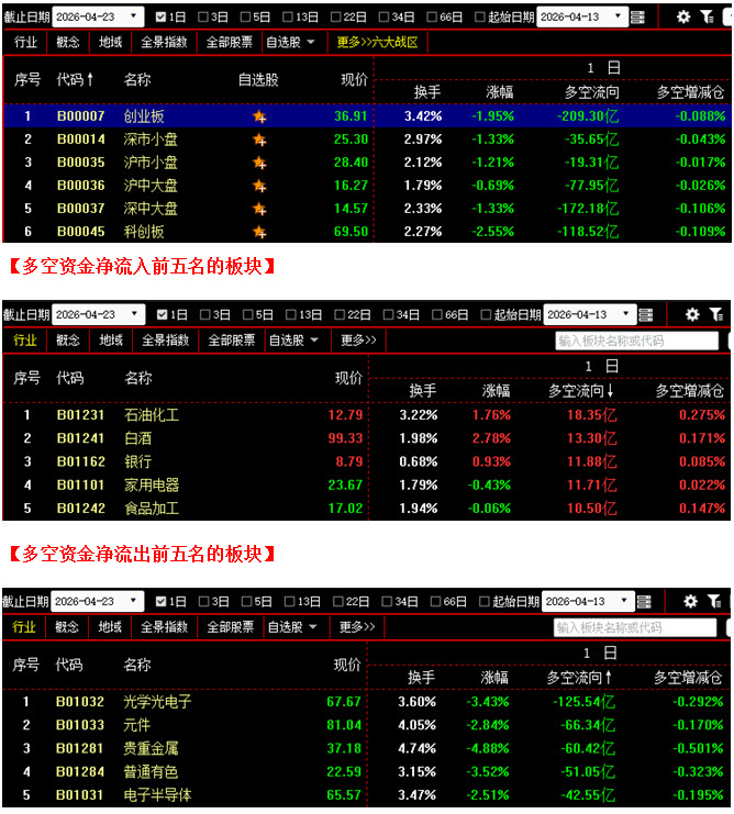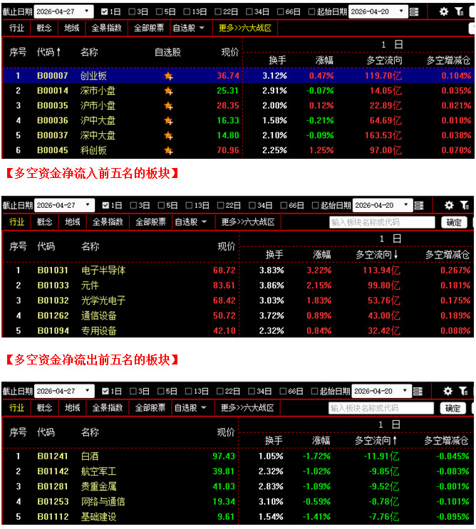 从表2的每日资金流入排行榜前五名来看,本周做多最为积极的是元件板块,该板块在本周五个交易日内四度出现在资金流入榜前五名之内。而在前两周,元件板块就一直在持续做多,从而带动科技类板块集体走强。由此可见,在4月份的行情中,元件板块是当之无愧的龙头板块,但需要注意的是,由于元件板块已经连续领涨了三周,有些相关个股已经积累了很大涨幅,调整的风险正在逐步加大,所以接下来若没有其它具有人气号召力的板块能够接力拉升,一旦元件板块在高位熄火,行情很可能会出现一波回落。