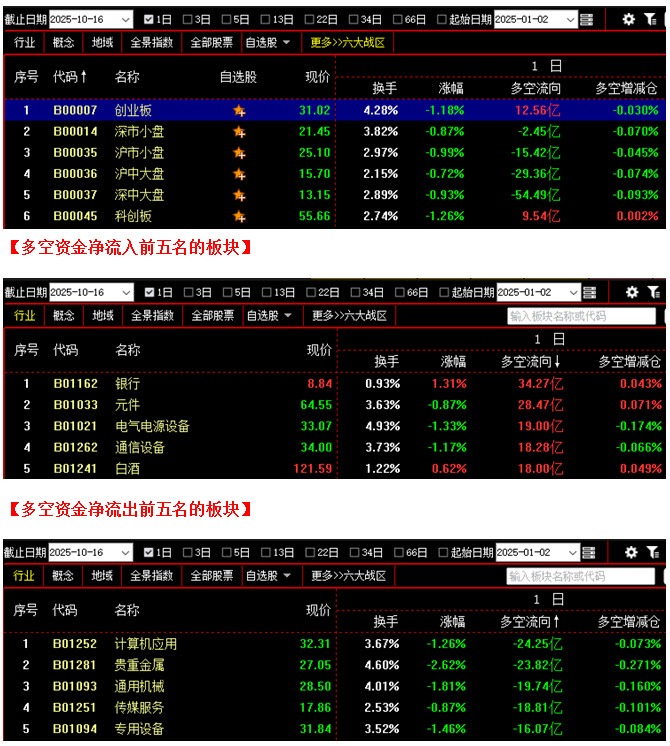 从板块资金动向数据来看,截止到今日收盘时,在资金流入榜上,银行板块以34.27亿的资金流入额位居榜首;其次是元件板块,资金流入28.47亿;此外,电气电源设备板块、通信设备板块、白酒板块也都相继上榜,三个板块的资金流入额分别为19.00亿、18.28亿、18.00亿;再看资金流出榜,计算机应用板块引领做空,资金流出24.25亿;其次是贵重金属板块,资金流出23.82亿;此外,通用机械板块、传媒服务板块、专用设备板块的资金流出额也都相对较多,分列资金流出榜第三到第五名位置。综合比较后可知,今日不仅银行板块资金流入达到34亿,对稳定大盘起到积极作用,而且元件、电气电源设备、通信设备、白酒等板块的资金流入额也都在18亿之上,场内仍不乏热点;不过空方也不甘示弱,除计算机应用板块与贵重金属板块资金流出双双超过20亿之外,通用机械、传媒服务、专用设备等板块资金流出额也都超过了16亿,对多方人气形成明显压制。从六大战区的情况分别来看,截止到今日收盘时,只有创业板战区与科创板战区均为资金流入状态,且两个战区的资金流入额均不足15亿;其余四个战区则均为资金流出,其中不仅沪中大盘战区资金流出接近30亿,深中大盘战区的资金流出额更是达到54亿。而从午评中可以看到,在中午收盘时,六大战区还均为资金流入状态,这就说明午后多方未能持续发力,场内抛压明显增大。在这种情况下,短期内行情在3900点附近很可能还会有震荡反复的可能。建议大家控制好仓位,同时密切关注场内多空资金的进出情况,若接下来资金仍能不断进场加仓,则可对后市继续看多做多;反之;如果多方后续力量不足,空方连续施压,导致大盘再次回落至3900点下方,后市则会有进一步下跌的可能,操作上则需谨慎。