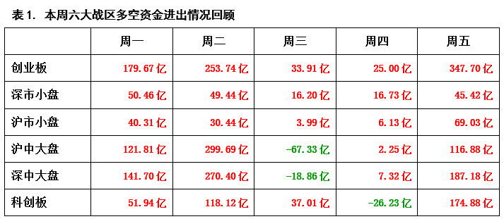 从表1的每日六大战区多空资金进出情况中可以看到,虽然在本周三与周四,空方都试图施压,但始终未能占据绝对优势;而在本周一、周二、以及周五的行情中,不仅六大战区均为资金流入状态,而且频频出现单日资金流入超过百亿,甚至超过200亿的战区,说明目前资金进场加仓的力度依然很大,多方仍牢牢的把控着短期市场的主动权。在这种情况下,后市行情很可能会继续震荡上行。