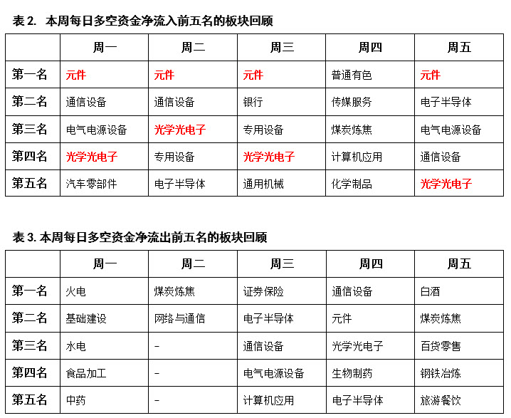 从表2的每日资金流入排行榜前五名来看,本周做多最为积极的是元件板块和光学光电子板块,这两个板块在本周五个交易日内均四度出现在资金流入榜前五名之内,元件板块更是四次均位居资金流入榜榜首。在他们的带动下,其他科技类板块在本周也积极做多,从而形成群体上攻效应,不仅有效的提升了多方人气,而且还推动大盘向上创出新高。在这种氛围下,后市行情很可能会继续上行。