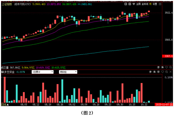 从图2中可以看到,虽然上周五市场出现了较大幅度的下挫,但本周一大盘并未继续杀跌,而是高开在13日成本均线上方,小幅震荡整理,最终收出一颗阴十字星;周二指数则快速站回到5日成本均线上方,并不断向上回升,将上周五的阴线实体完全吞没,从而及时的消除了短期的不利影响;周三与周四,大盘虽没有继续向上快速拉升,但指数均运行在5日成本均线上方,3900点整数关口附近的支撑也被多方逐步夯实;于是周五多方继续向上发起冲击,大盘越过10月9日的3936点,向上创出新高,为后市进一步上攻打开了空间。不过需要注意的是,从下方的多空资金运行情况来看,虽然本周大盘呈现逐步向上的运行状态,但只有周一与周二资金为流入状态,周三到周五资金均为流出。好在相比周一与周二的资金流入量来说,周三到周五的资金流出量并不是很大,多方仍有上攻机会。建议大家仍要控制好仓位,同时密切关注场内多空资金的进出情况,若接下来多方及时发力,市场就有望继续上行;反之,如果多方后续无力,空方连续施压,则不排除大盘还有再次回探到3900点下方的可能。