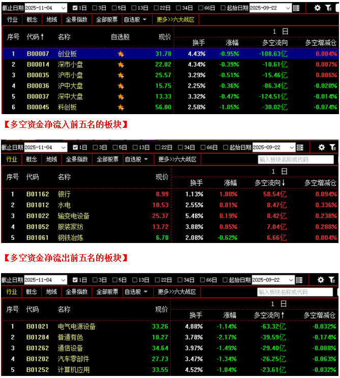从板块资金动向数据来看,截止到今日收盘时,在资金流入榜上,银行板块以58.54亿的资金流入额位居榜首;其次是水电板块,资金流入8.47亿;此外,输变电设备板块、服装家纺板块、钢铁冶炼板块的资金流入额也都相对较多,分列资金流入榜第三到第五名位置;再看资金流出榜,电气电源设备板块引领做空,资金流出63.32亿;其次是普通有色板块,资金流出39.59亿;此外,通信设备板块、汽车零部件板块、计算机应用板块也都相继上榜,三个板块的资金流出额分别为29.40亿、26.25亿、23.61亿。综合比较后可知,今日不仅电气电源设备板块资金流出高达63亿,普通有色、通信设备、汽车零部件等板块的资金流出额也都在25亿之上,场内恐慌情绪逐步蔓延,多方人气受到压制,全天资金流出超过10亿的板块达到17个;反观多方阵营,虽然银行板块资金流入接近60亿,对大盘形成一定支撑作用,但其余板块的资金流入额均不足9亿,做多力量明显偏弱。从六大战区的情况分别来看,截止到今日收盘时,六个战区均为资金流出状态,其中不仅沪中大盘战区资金流出高达86亿,创业板战区与深中大盘战区的资金流出额更是双双超过百亿。可见虽然昨日下午行情出现回升,但今日多方却无力向上发起连续冲击。在这种情况下,后市方向就依然难以判断,所以选择退出观望的投资者明显增多,从而导致场内抛压再次增大,各战区均有资金流出。建议大家密切关注场内多空资金的进出情况以及5日成本均线的得失情况,若接下来多方力量依然不足,大盘无法在短期内快速夺回5日成本均线,则需适当降低仓位,以谨慎操作为主。