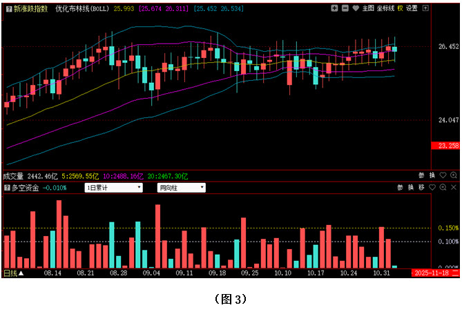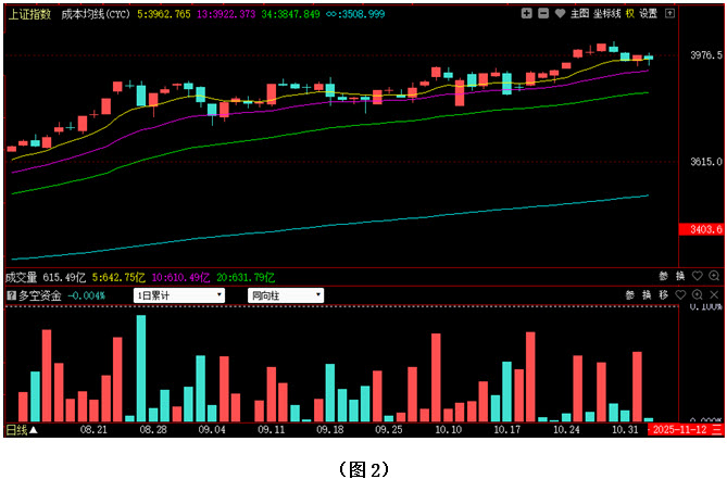 再看图2,今日大盘小幅回落,收出阴线。虽然跌幅不大,但指数却再次回落至5日成本均线下方,同时昨日的阳线也几乎被完全吞没,可见昨日行情的反弹未能得到延续,市场短期走势仍面临着转弱的危险。从下方的多空资金来看,今日多空资金为流出状态,虽然资金流出量明显小于昨日的资金流入量,说明目前场内多数投资者持股信心依然较为稳定,但如果接下来多方无法及时上攻,大盘继续向下跌破13日成本均线支撑,场内的恐慌性抛盘就可能快速增多,从而导致行情在后市出现更深幅度的调整。建议大家控制好仓位,保持谨慎,个股方面可关注前期调整较为充分且股价短期走势刚刚重新转强的品种,逢低逐步吸纳。