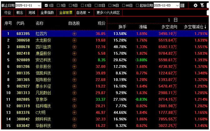 如图1所示,今日早间大盘小幅高开,并略作上冲,盘中一度摸至4024.94点,虽已极为接近10月30日的4025高点,但仍未能形成突破,随后指数震荡下探,再次回落至4000点下方,直到3990点附近才获得支撑,并有所反弹,午后大盘则是围绕着4000点整数关口窄幅震荡整理,最终以4002点收盘。从下方的多空资金来看,早间开盘后,多方率先占据优势,且资金一度快速流入,但随着大盘持续回探,场内抛压开始不断加大,资金由红翻绿,并在午后出现较大流出。可见今日多空双方互不相让,你争我夺,导致行情仍在4000点附近反复拉锯。在这种情况下,市场中的热点轮换速度往往较快,投资者若频繁追涨杀跌很可能会得不偿失。故此建议大家控制好仓位,同时关注近期有资金连续加仓且股价短期走势刚刚转强的个股,择机逢低介入。