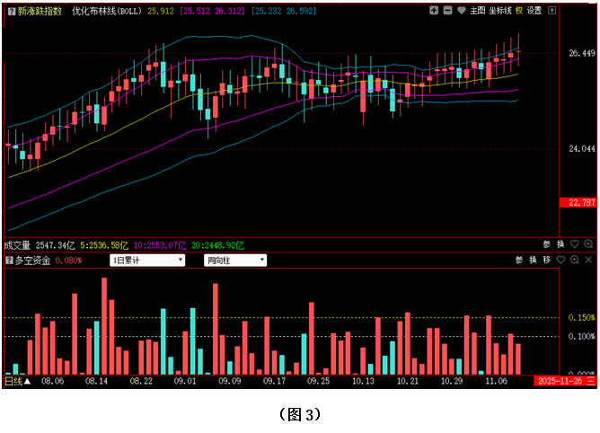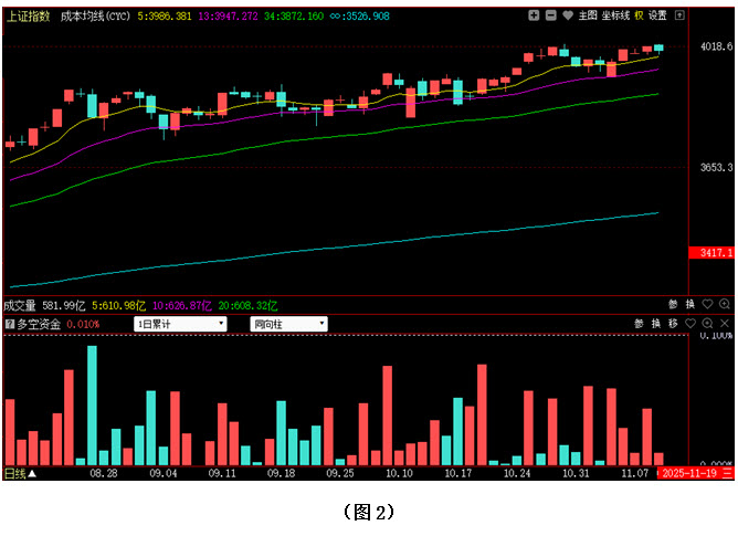 再看图2,今日大盘未能延续前几日的震荡攀升走势,而是小幅回探,收出阴线。不过指数仍全天运行在5日成本均线上方,市场短期强势格局并没有发生改变,所以接下来只要多方继续发力,行情就仍有向上创出新高的可能。从下方的多空资金来看,今日多空资金为流入状态,虽然资金流入量较昨日明显减少,但资金的连续流入表明,行情的回探只是减缓了场外资金进场加仓的速度,而并没有引发大规模的恐慌性抛盘。在这种情况下,市场向下的空间就十分有限,后市或仍有继续上行的可能。建议大家把握好市场节奏,提前优选个股,逢低介入。