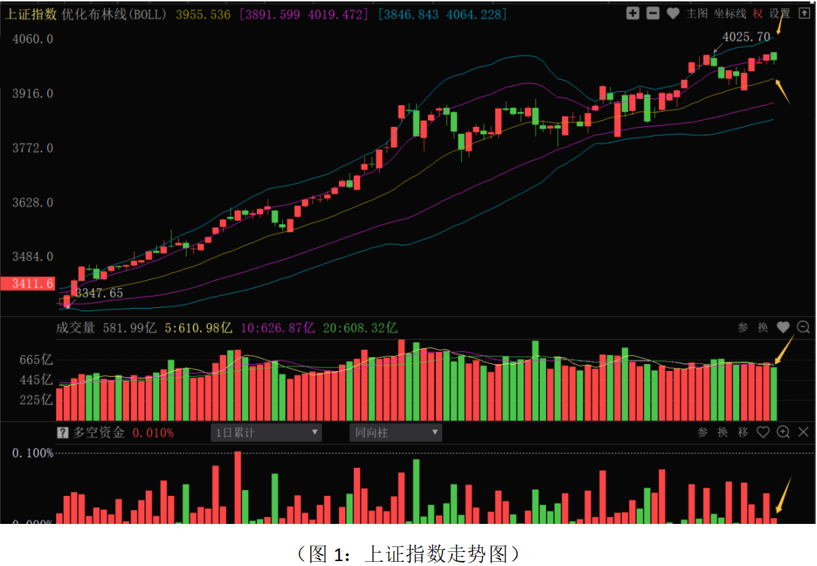 从上证指数走势来看:股指继续在近期高点和4000点整数关口震荡,成交量明显萎缩,多空资金小幅净流出38.61亿元,可以看出短线资金有一定的观望和谨慎态度。对于资金的观望态度,近期早评已经多次提醒,第一点:政策维度来看,由于三季度GDP增速5.2%,全年完成5%的既定目标是大概率事件,在12月中央政治局会议之前,新的稳经济政策定调和超预期政策出台的急迫性降低,市场整体做多积极性难以大幅提升。第二点,从技术维度来看,4000点位置总体上是心理压力,但6124点和5178点连线的下降趋势线是中期重要压力,由于当前点位距离该下降趋势线较近,在没有新的政策指引下,近期资金有畏高的情绪。第三点,从板块结构来看,科技成长板块处于震荡调整阶段,虽然周期类、消费类板块有所轮动和活跃,但板块的此消彼长和对冲走势不能形成合力。所以,在4000点一带出现震荡走势也是情理之中。目前股指仍运行在5日成本均线之上,技术走势仍是强势,在中美经贸谈判结果向好,国内中期政策有稳定性和延续性的背景下,股指突破8月底的箱体震荡走势,围绕4000点大关进入新的强势震荡格局中。基于8月底以来市场一直沿着13日成本均线上行,该位置也是股指“进三退二”螺旋式上涨的重要支撑均线,目前波段趋势仍是向上状态。当前成交量持续萎缩,增量资金进场积极性不高,资金整体活跃度会有所降低,制约股指的上行力度,股指将以横向整理为主。从优化布林线指标来看,股指目前围绕中上轨(4020点)震荡,处于相对强势状态,下方中轨位置(3955点)有一定支撑,指标上轨位置(4060点)是阶段压力区,在指数对8月底震荡区间突破回抽确认之后,股指震荡区间有望从之前的3900—4000点区间上移至3950—4050点区间。从0Z指数走势来看:股指在中、短期成本均线上方窄幅震荡,多空资金净流出26.59亿元,短线资金进场积极性不高。不过,行情震荡阶段全市场上涨个股家数稍多于下跌个股家数,并没有出现普跌走势,仍有局部的结构性机会。活跃市值中、短期成本均线处于空头排列状态,资金整体活跃度不高,尤其是科技制造、有色周期等热点的短线震荡,资金风险偏好有所降低,尚不支持板块和个股的普涨,机会主要在中期涨幅小或调整充分的板块轮动上。从短期结构牛指标组来看:马股比例从71%左右逐步下降至61%左右,牛股比例明显抬升至25%左右,熊股比例低位徘徊回升不明显,说明部分调整充分或横盘个股二次启动机会仍然在增加。操作上应采取稳健策略应对,总仓位控制在7成左右,底仓持股为主,浮动仓位可适当捕捉结构性机会,紧盯大盘关键技术压力的资金流向做好低吸或高抛的操作。