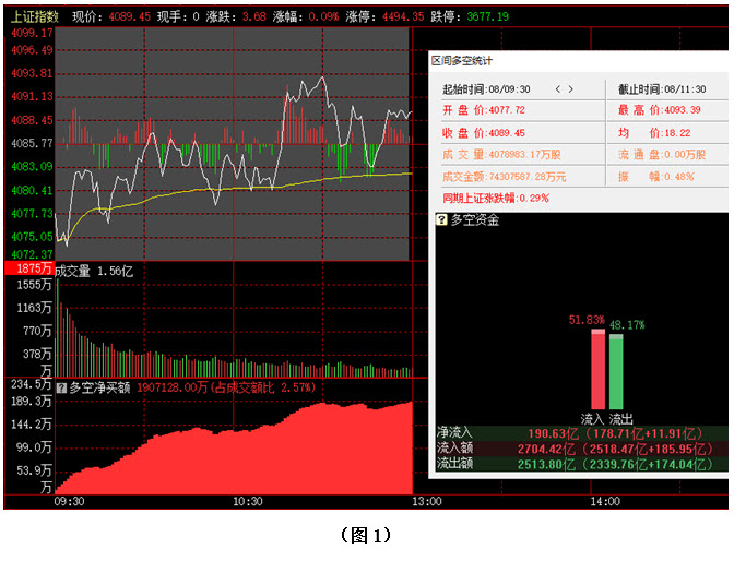 今日早间大盘小幅低开,但市场并未趁势回探,而是逐步向上回升,盘中更是一度摸至4093点,可惜依然未能对4100点整数关口形成突破,至中午收盘时,指数位于4089点。从日K线图上看,今天上午大盘走势与昨日基本相同,指数继续在周二的收盘点位附近震荡整理,虽没有大幅向上拉升,但依然完全运行在5日成本均线上方,市场短期强势格局丝毫没有改变。从下方的多空资金来看,早间开盘后,多方就占据优势,随后资金持续流入。截止到中午收盘时,沪市当中多方力量高于空方超过3个百分点,资金流入190多亿。从六大战区的情况分别来看,截止到今日中午收盘时,六个战区均为资金流入状态,其中不仅沪中大盘战区与科创板战区资金流入双双超过75亿,创业板战区与深中大盘战区的资金流入额更是均在120亿之上。可见今日上午资金进场依然十分积极,多方力量明显强于空方。在这种情况下,投资者的做多热情就会继续维持在较高水平,所以行情虽看似在高位徘徊不前,却不会引发大量资金出逃,反而会令市场下方基础逐步夯实,有利于后市进一步向上攀升。建议大家在控制好仓位的同时,关注近期有资金连续增仓的板块,并在其中优选个股,择机介入。