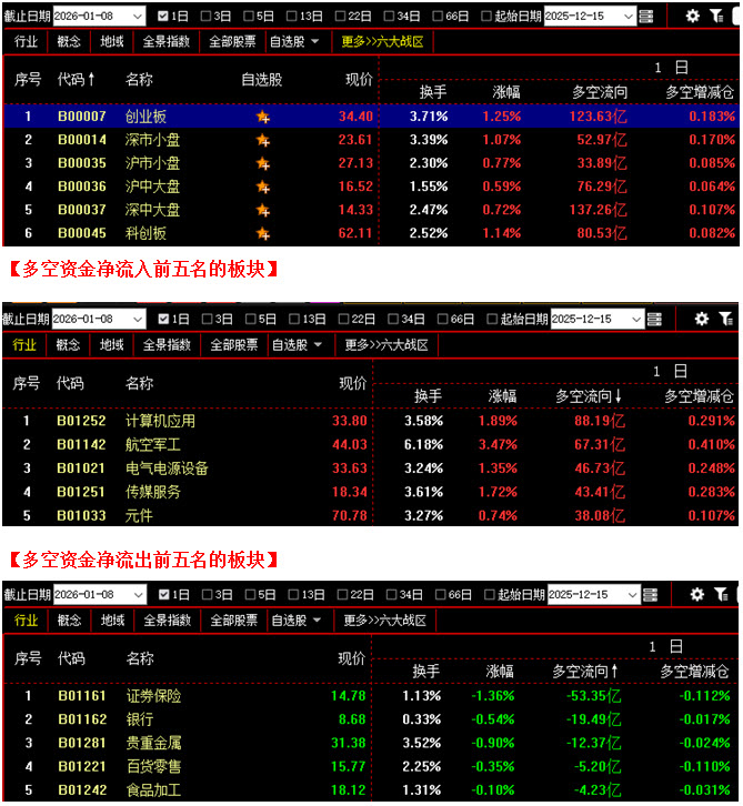 从板块资金动向数据来看,截止到今日午间收盘时,在资金流入榜上,计算机应用板块以88.19亿的资金流入额位居榜首;其次是航空军工板块,资金流入67.31亿;此外,电气电源设备板块、传媒服务板块、元件板块也都相继上榜,三个板块的资金流入额分别为46.73亿、43.41亿、38.08亿;再看资金流出榜,证券保险板块引领做空,资金流出53.35亿;其次是银行板块,资金流出19.49亿;此外,贵重金属板块、百货零售板块、食品加工板块的资金流出额也都相对较多,分列资金流出榜第三到第五名位置。综合比较后可知,今日上午不仅计算机应用板块资金流入高达88亿,航空军工、电气电源设备、传媒服务、元件等板块的资金流入额也都在38亿之上,场内热点不断涌现,多方人气继续维持在较高水平,仅半天时间,资金流入超过10亿的板块就多达19个;反观空方阵营,虽然证券保险板块资金流出高达53亿,同时银行板块的资金流出额也接近20亿,对大盘形成压制作用,但与多方力量相比,场内整体抛压并不是很大。可见今日上午尽管证券保险、银行两大权重板块有刻意压盘动作,但投资者的做多热情却丝毫没有受到影响,资金积极进场加仓,多方后续力量依然十分充足。在这种情况下,空方显然无法连续施压,行情自然也就难以出现大幅回落,后市则有望在资金的推动下继续向上震荡攀升。建议大家紧跟资金步伐,在市场向上趋势未发生改变之前,操作上仍可以持股做多为主。