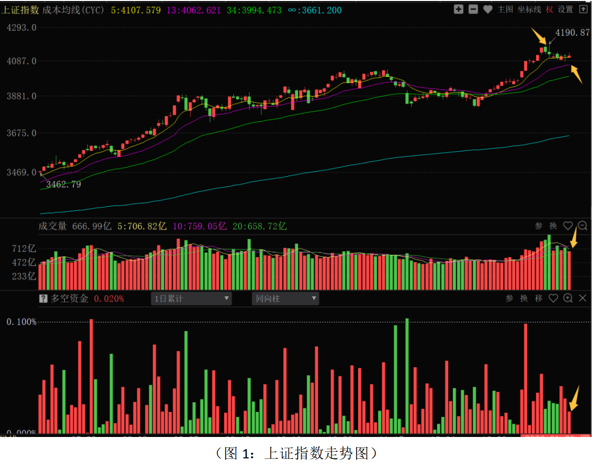 从上证指数走势来看:股指继续围绕5日成本均线窄幅震荡,成交量总体萎缩,多空资金净流入426.94亿元,资金有一定的回流动作。但是,股指冲击4150点附近有所回落,K线上留有明显的上影线,显示资金追涨意愿有所不足,前期高点位置有一定的技术压力和获利盘抛压,股指短期上行动力有所不足。昨日尾盘在股指明显回落的时候,多个宽基ETF再度出现放量走势,显示大资金“托底”维护市场稳定的动作较为明显。板块结构上,46个板块上涨,24个板块下跌,其中前一日活跃的电力设备、煤炭、银行、消费、地产产业链出现一定的调整;有色金属、芯片半导体、机器人等前期主线热点再度活跃。总体上,在稳字当头、巩固市场稳中向好势头,坚决防止市场大起大落的政策定调,以及宽基ETF多次放量维护市场稳定的背景下,股指短期调整有限。同时,在商业航天、人工智能等前期热点做空动能得到较为充分释放之后,资金对相关板块有一定的回补动作,市场有望维持大盘稳定、弹性较大的科技制造板块活跃的局面。中期走势上,股指已经对去年11月的平台位置形成技术突破,短期调整是突破后的震荡整固确认的走势,4050点一带有较强技术支撑。13日成本均线逐步向上运行,有望对股指形成短期支撑,股指近期运行节奏会从前期急涨的态势转向震荡缓涨的节奏,运行空间4050-4150点,热点会维持“高低切换”和快速轮动,热点轮动空间相比前期会有所减弱,不宜盲目追涨操作。从0Z指数走势来看:股指连续回抽整固5日成本均线之后再度强势上行,全市场上涨个股家数多于下跌个股家数,多空资金净流入1064.29亿元,对比上海市场资金流向来看,资金对中小市值品种操作较为积极。在提高融资保证金平抑短期亢奋情绪之后,市场整体由恐慌状态转为平稳状态,短期持筹稳定性有所提升。活跃市值冲高回落,短期增量资金进场积极性不高,市场有望维持结构性的轮动机会,市场再度转向存量博弈和热点轮动格局。当前操作上可采取稳健策略应对,总仓位控制在6-7成,底仓持股为主,浮动仓位应根据个股的资金流向和决策信号做好仓位调整,并在行情震荡阶段做好“高低切换”的低吸操作。