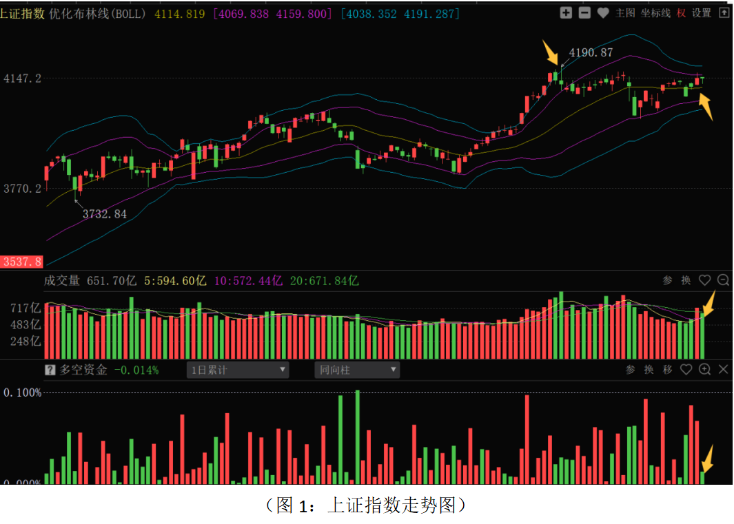 从上证指数走势来看:昨日股指围绕前一日阳线实体窄幅震荡,平盘报收,成交量略有萎缩,多空资金净流入145.87亿元,相比前两日多空资金流入有所降低。板块结构上,70个板块中32个板块上涨,38个板块下跌,板块整体涨幅较前两日有所下降。行业景气度相对较弱的消费类板块,以及近两日活跃的石油化工、有色、地产、券商等板块跌幅居前,相关板块中一线和二线蓝筹居多,短线的调整对大盘走势有一定的承压。同时,科技制造等板块再度活跃,对冲消费、资源板块的负面影响,对短线资金的风险偏好有一定的维持作用,资金表现明显的高低切换和板块轮番炒作的特点。目前股指运行在5日、13日成本均线上方,并且中短期成本均线处于多头排列状态,短线的震荡属于技术突破后的震荡整固状态,总体走势属于强势走势。节后市场连续上攻之后,对春节假期期间,以及上海地产新政等利好消息有了集中的释放和反映,由于近两日石油化工、煤炭、有色板块涨幅较为明显,短线需要消化获利盘的抛压,对大盘走势仍有一定的承压。技术上,股指面临前期4200点高点和交易所调整融资保证金比例位置的技术和心理压力,短线追涨积极性总体不高。不过,央行对市场流动性释放的呵护,两会临近,政策预期有所升温,叠加前期管理层关于巩固资本市场稳中向好势头,防止市场大涨大跌的政策基调下,近期市场走势将以稳定和强势震荡为主,短线股指难有大的下跌空间,但能否进一步向上拓展空间,还需两会对今年经济增长目标、财政政策力度等重要指标的明确部署,近期市场会进入整体稳定、热点高低切换和轮动的局面。从优化布林线来看,目前股指站在中轨上方,波段趋势属于强势阶段。同时,该指标处于缩口状态,一方面股指震荡幅度会趋窄,中上轨和上轨位置是短线技术压力(4160—4190点左右),中轨是短线重要技术支撑,如果中轨跌破,下方支撑在中下轨的4070点左右;另一方面市场经过连续震荡之后或将面临方向选择。从0Z指数走势来看:股指小幅上涨,全市场下跌个股家数稍多于上涨个股家数,多空资金净流入402.80亿元,较前两日有明显的下降。活跃市值继续小幅反弹,说明市场在震荡过程中资金有小幅进场的动作。但是,活跃市值短线面临5日和13日成本均线的压力,增量资金进场意愿和力度有待观察,叠加前期高点压力和股指远离短期成本均线,技术上短线有超买状态,后续资金不能持续进场,防止获利盘和解套盘抛压带来的个股分化和指数的震荡。当前操作上应继续采取稳健策略应对,总仓位控制在六成左右,底仓持股为主,浮动仓位不宜激进追涨,可适当关注前期调整充分的低位品种,对于短线超跌反弹或上涨至重要技术压力位的品种,应根据关键位置资金流向和短线决策信号做好仓位调整。