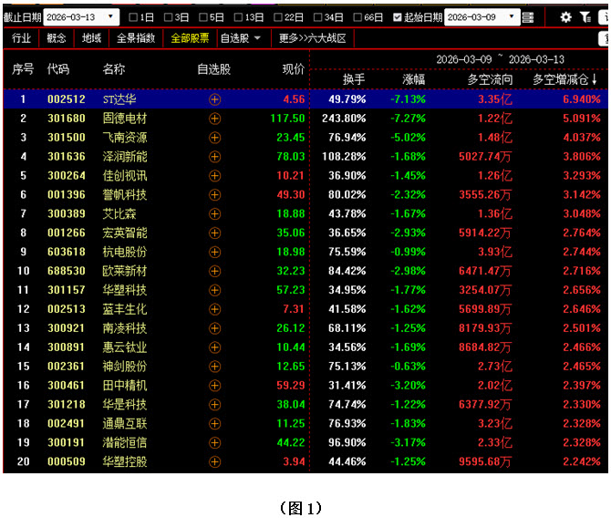 【3月9日至3月13日多空资金增仓前300名中涨幅最小的20只个股】