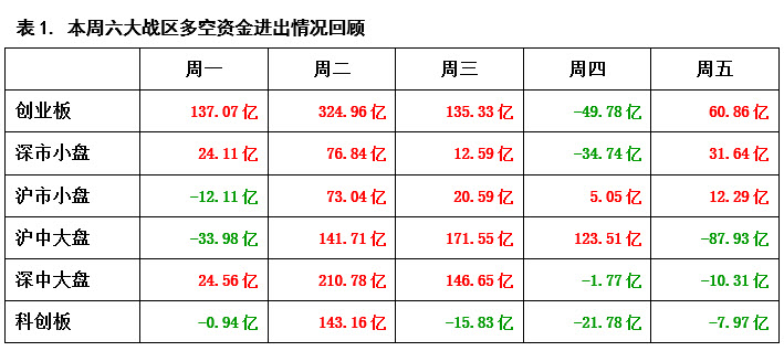 从表1的每日六大战区多空资金进出情况中可以看到,本周一场内曾出现一定抛压,但周二多方就全面发力,不仅六大战区当天均为资金流入状态,创业板战区的资金流入额更是高达324亿!可惜多方的后续力量并没有及时跟上,从周三到周五,抛压越来越大,从而导致市场迟迟无法进一步上攻,投资者的做多信心逐渐衰退,周五大盘更是再次跌破了4100点整数关口。可见虽然就全周而言,多方依然占据着一定的优势,但也要防止接下来空方出现连续施压的状态。