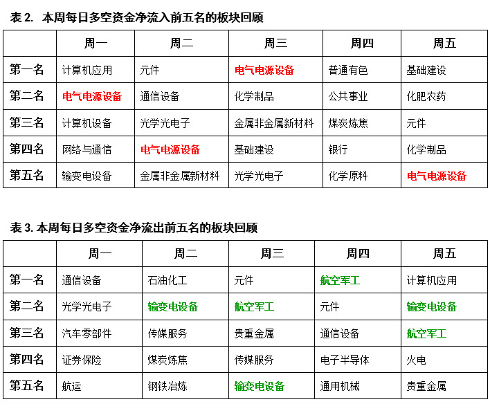 从表2的每日资金流入排行榜前五名来看,本周做多最为积极的是电气电源设备板块,该板块在本周五个交易日内四度出现在资金流入榜前五名之内。电气电源设备板块在上周就曾连续发力做多,本周依然有资金持续加仓,说明在中东局势紧张、国际油价极为不稳定的背景下,市场对电力能源的关注出现显著增加。所以如果接下来中东局势仍没有得到明显缓解,电力相关板块以及个股仍将是值得我们关注的重点。