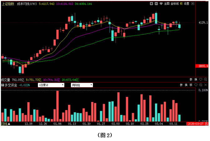 从图2中可以看到,继上周三之后,本周一指数在盘中再度跌至34日成本均线下方,好在市场没有持续杀跌,大盘经过反弹后,当天就收复了34日成本均线;周二大盘继续向上回升,指数冲破5日成本均线与13日成本均线的双重压制,市场短期走势出现转强迹象;可惜周三与周四,指数都未能出现强有力的上攻,导致大盘迟迟无法深入到上周二的阴线实体内部,这就意味着一旦空方再度施压,行情将仍有反复的可能;结果不出所料,周五大盘低开,并再度下探,不仅5日成本均线与13日成本均线相继失守,4100点整数关口也被击穿,收盘位置只是略高于34日成本均线。若下周多方无法及时反击,空方连续施压,34日成本均线很可能会被有效跌破,届时市场或将出现更大幅度的调整。从下方的多空资金运行情况来看,本周一与周五,资金均为流出状态,而周二到周四,资金则为连续流入,且周一的资金流出量明显小于周二的资金流入量,周四的资金流入量也大于周五的资金流出量,所以就全周来说,多方依然占据着优势。不过我们也不能因此就掉以轻心,因为回顾今年大盘在2月初与3月初的两次杀跌,可以发现,一旦空方连续施压,恐慌情绪就很可能快速蔓延,从而导致恐慌性抛盘大量涌出,市场下跌速度骤然加快。故此建议大家在控制好仓位的同时,密切关注多空资金的进出情况以及34日成本均线对大盘的支撑情况,以便及时掌握行情变化,并做出相应决策。