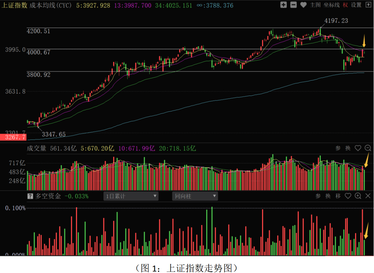 消息面,美伊达成两周停火协议之后,一度提振全球资本市场的做多积极性。但是,随后以色列持续袭击黎巴嫩,霍尔木兹海峡航运再度受阻,油价反弹,市场资金避险情绪再度抬升,部分资金从科技成长板块回流至油气资源等板块。目前影响市场走势和资金操作积极性的重要变量,依然是美伊谈判进程和结果。如果谈判结果向好,无疑会再度激发市场做多积极性。相反,如果谈判结果低于预期,短期市场避险情绪会再度抬升。眼下处于美伊谈判的窗口期,谈判的不确定性会增加资金观望情绪,市场总体处于反弹后的观望阶段。上市公司年报、一季报披露阶段,在弱势震荡筑底的阶段,市场短期题材炒作的力度会相对减弱,机会会向确定性高的业绩方向切换,个股分化会加大,大盘整体指数难有大的表现。由于国内一季度经济运行总体较好,叠加稳经济政策定调和落实较为积极,市场仍会表现出一定的韧性,近期走势将以阶段震荡筑底为主。从上证指数来看,周三股指强势反弹至4000点大关附近,由于中东局势的反复性,造成短期缩量小幅调整,多空资金净流出34.91亿元,总体上资金并没有出现恐慌性的抛售。短线走势来看,股指站上5日成本均线,并且突破3月底到4月初的小平台位置,短线趋势有所好转。从近大半年的市场走势来看,技术上走出以4000点整数大关为中枢的3800—4200点的箱体走势。目前4000点位置既是13日、34日成本均线黏合处,又是1-3月震荡平台的颈线位置,有明显的技术压力,波段趋势没有明显转强。从筹码密集峰来看,上方筹码密集峰在4080点—4150点一带,距离当前股指仍有一定的距离,短期筹码的真空地带压力相对较小,理论上有技术反弹的空间。但是,能否反弹持续,还需中东局势的进一步好转,否则资金追涨积极性不高,难以形成大的突破。在美伊谈判、年报和一季报业绩披露的窗口期,股指可能围绕3950—4050点区间震荡,能否向上或向下突破重点关注中东局势的发展。从0Z指数走势来看,股指小幅调整,全市场超过4200只股票下跌,个股走势从前一日的普涨走势转为普跌调整走势。同时,多空资金并没有大幅流出,小幅净流入35.40亿元,意味着中东局势的反复性对市场并没有形成新一轮的恐慌杀跌走势。技术上,股指强势反弹之后,面临34日成本均线和无穷成本均线的压力,中东局势的不稳定性,并不支持股指进一步向上拓展空间。同时,近期只要谈判期间没有超预期的不利因素出现,市场将以缩量震荡为主。近期操作策略应继续采取稳健策略应对,总仓位控制在6成左右,底仓持股为主;短线仓位大盘上涨不追高,低吸操作为主,部分品种应趁反弹根据关键位置资金流向和短线决策信号做好仓位调整。