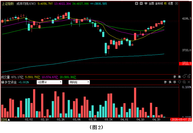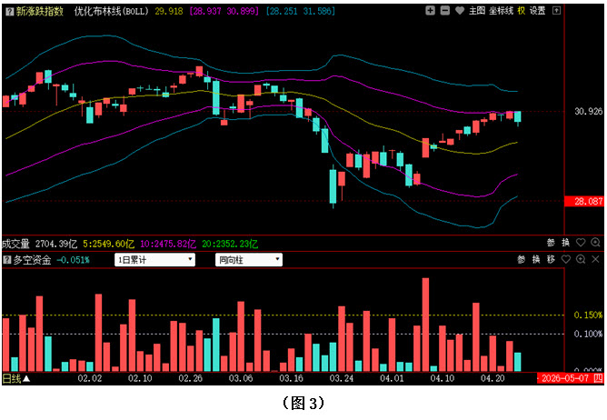 再看图2,今日大盘未能延续前几日的连续上攻走势,而是出现回落,收出阴线。好在由于回落幅度较小,目前指数依然完全运行在5日成本均线上方,所以市场短期强势格局并没有发生根本改变,只要接下来多方及时发力反击,行情就仍有依托着5日成本均线继续震荡上行的可能。从下方的多空资金来看,今日多空资金为流出状态,但资金流出量很小,所以只要空方无法连续施压,短期市场的主动权就仍会掌握在多方手中,行情也就很难出现大幅调整。建议大家在控制好仓位的同时,密切关注5日成本均线对大盘的支撑情况以及场内多空资金的进出变化,若多方后续力量及时跟上,且指数始终保持在5日成本均线上方,操作上就可继续以看多做多为主。