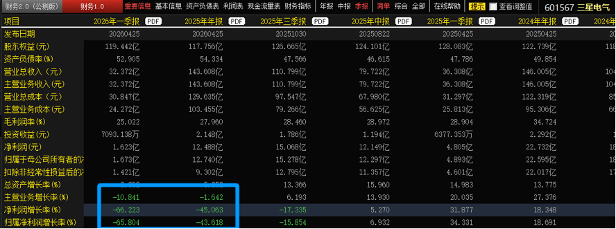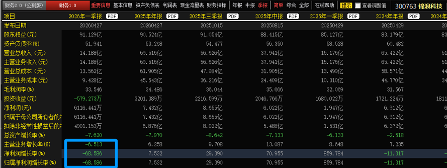 再比如逆变器龙头之一的锦浪科技,去年年报还小幅增长,今年一季度业绩突然变脸,大幅下滑68.6%。类似的还有海泰科,25年年报业绩还大幅增长234%,26年一季报却大幅下降138%,这类变脸股票被投资者选择抛售,导致价格暴跌。