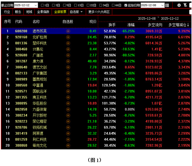 从昨日多空资金流向来看:70个板块中56个板块资金净流入,14个板块资金净流出,整体板块主力资金进场积极性有所回流。其中光学光电子、汽车零部件、电子半导体、主营房地产、专用设备、百货零售、传媒服务、航空军工等板块资金流入居前;银行、电气电源设备、元件、计算机设备、输变电设备、包装印刷、石油化工、贸易等板块资金流出居前。资金流出居前的板块主要集中在高股息银行、新能源光伏赛道、以及部分近期反弹居前的元件和中科曙光重组失败带来的计算机设备板块;资金流入居前的板块主要集中在算力硬件、地产、百货零售消费板块,以及基建相关的专用设备等板块上。总体上算力硬件板块资金操作较为积极,政策消息驱动的地产、消费、海南板块轮动走强。对于地产和百货零售等板块的走强,一方面是资金的高低切换,另一方面是政策消息驱动,能否持续还需消息的进一步确认和落实。由于市场成交量总体萎缩,一线和二线蓝筹集中的地产和消费板块持续性或有不足,部分个股面临筹码密集峰和中期技术压力或面临分化,科技制造板块经过短期获利盘和解套盘消化之后机会逐步增加。在市场走势总体稳定局面下,短线炒作气氛会有所延续,“十五五”规划政策支持明确的方向,如机器人、人工智能、核能、可控核聚变、智能电网、低空经济等方向会局部轮动活跃。接下来,上市公司即将进入年报业绩预告的窗口期,经过三季度的持续上涨之后,行业景气度和上市公司业绩成为跨年行情机构调仓和布局的重点,绩优蓝筹和成长白马中期机会会增强。近期选股上应以稳健策略选股为主,需加大基本面业绩和中期资金维度的选股,并做好长短结合配置。中线选股继续重点挖掘全年业绩增长较为确定、估值合理,保险资金、社保资金、外资以及牛私募进场、尚未大幅脱离成本的红利蓝筹和成长白马。短线选股应关注超跌反弹后震荡阶段主力资金继续明显回流的个股,尤其关注上述“十五五”规划政策支持明确方向。提醒大家,跨年布局窗口,聪明的主力资金早已暗中布局,其重仓品种往往是中线大牛!现阶段要紧跟主力动向抓资金龙头,使用“区间多空统计”功能可抓到“富祥药业、永太科技、华盛锂电”等热门股,手机版使用“区间多空统计”功能筛选资金龙头的详细步骤请点击学习。如图1: