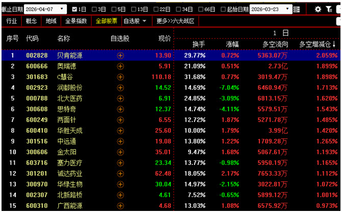 【3月30日至4月3日多空资金增仓前300名中涨幅最小的20只个股】