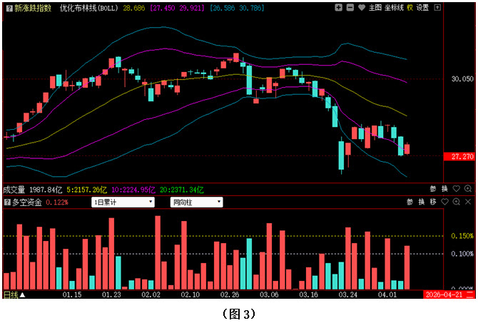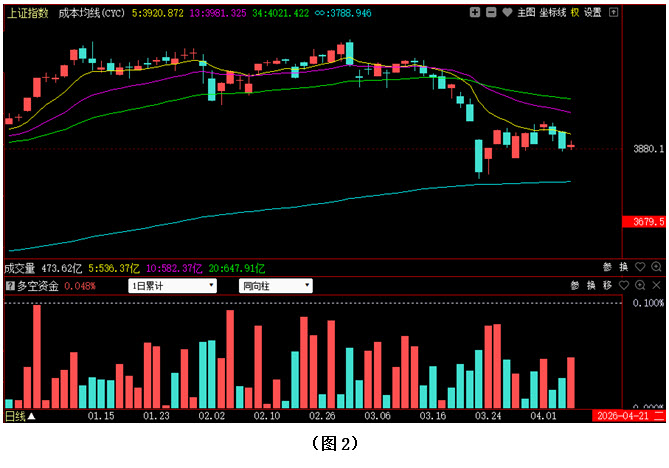 从图2中可以看到,本周一大盘虽出现较大幅度的低开,但市场并未趁势杀跌,指数经过回升后,最终不仅以阳线报收,而且收盘位置比上周五有所提高;周二多方试图向上突破5日成本均线压制,可惜未能站稳,指数冲高回落后,持续下探,到收盘时几乎将周一的阳线实体完全吞没;然而周三大盘却直接高开在5日成本均线上方,并小幅收阳,这是自3月13日调整以来指数首次收盘在5日成本均线之上;可是正当大家感觉市场短期走势已经有望进一步好转的时候,周四与周五,大盘却连续杀跌,不仅5日成本均线再次失守,3900点整数关口也被又一次击穿。从下方的多空资金运行情况来看,本周除周三为资金流入之外,其余四个交易日资金均为流出状态,且周五的资金流出量比周四还有所放大,说明随着3900点整数关口的再次失守,恐慌性抛盘开始增多。在这种情况下,建议大家依然要注意控制好仓位,同时密切关注多空资金的进出情况以及5日成本均线对大盘的压制情况,若下周多方连续发力,指数轻松站上5日成本均线,市场就有望继续向上反弹;反之,如果多方依然无力,空方持续施压,行情很可能会有进一步下探的动作,操作上则需以谨慎为主。