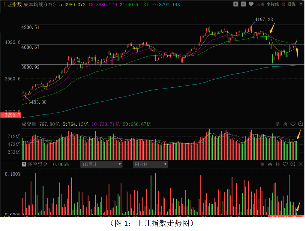 今日两市上涨个股共4065只,其中涨幅超过3%的个股810只,涨幅在9.9%以上的个股111只;下跌个股共1004只,其中跌幅超过3%的个股77只,跌幅在9.9%以上的个股4只。图3所示为指南针特有的0Z指数K线图,从图中可以看到,今日0Z指数同样轻松吞没了昨日阴线,并继续向上拉升,最终以阳线报收,收盘位置已接近优化布林上紫线。可见今日场内多数个股都出现了上涨,市场整体走势依然较强。从下方的多空资金来看,今天多空资金为流入状态,且资金流入量较昨日明显放大,说明有更多资金快速加入到了做多行列。在这种情况下,市场的短期主动权就会继续掌握在多方手中,后市则有望进一步向上回升。建议大家积极优选个股,择机介入。