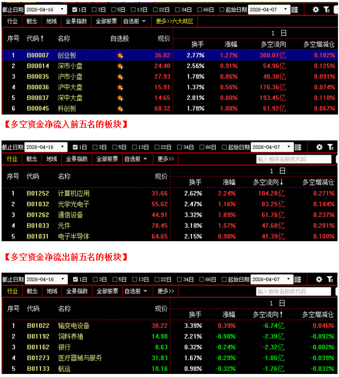 从板块资金动向数据来看,截止到今日收盘时,在资金流入榜上,计算机应用板块以135.39亿的资金流入额位居榜首;其次是光学光电子板块,资金流入96.19亿;此外,通信设备板块、普通有色板块、元件板块也都相继上榜,三个板块的资金流入额分别为87.06亿、68.69亿、64.04亿;再看资金流出榜,银行板块引领做空,资金流出7.84亿;其次是航运板块,资金流出4.79亿;此外,输变电设备板块、家用电器板块、火电板块的资金流出额也都相对较多,分列资金流出榜第三到第五名位置。综合比较后可知,今日不仅计算机应用板块资金流入高达135亿,光学光电子、通信设备、普通有色、元件等板块的资金流入额也都在60亿之上,不难发现,其中主要都是科技类板块,它们的集体大幅做多形成了群体上攻效应,带动场内多方人气进一步提升,全天资金流入超过10亿的板块多达24个;反观空方阵营,除银行板块资金流出高于7亿之外,其余板块的资金流出额均在5亿之下,与多方力量相比,整体抛压很小。从六大战区的情况分别来看,截止到今日收盘时,六个战区均为资金流入状态,其中不仅沪中大盘战区与深中大盘战区资金流入双双超过220亿,创业板战区的资金流入额更是高达400亿。可见今日多方全面发力,资金进场十分坚决,以致空方毫无还手之力。在这种情况下,投资者的做多热情就会继续保持在较高水平,行情突然连续大幅回落的可能性较小,后市则有望在资金的推动下进一步向上攀升。建议大家在控制好仓位的同时,积极关注近期有资金连续加仓的板块,并在其中优选个股,逢低吸纳。