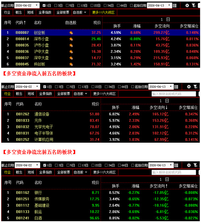 从板块资金动向数据来看,截止到今日收盘时,在资金流入榜上,通信设备板块以165.12亿的资金流入额位居榜首;其次是元件板块,资金流入153.26亿;此外,光学光电子板块、电子半导体板块、计算机应用板块也都相继上榜,三个板块的资金流入额分别为131.91亿、102.12亿、67.99亿;再看资金流出榜,银行板块引领做空,资金流出17.05亿;其次是传媒服务板块,资金流出12.35亿;此外,基础建设板块、航运板块、白酒板块的资金流出额也都相对较多,分列资金流出榜第三到第五名位置。综合比较后可知,今日不仅通信设备板块资金流入高达165亿,元件、光学光电子、电子半导体等板块的资金流入额也都在百亿之上,科技类板块的集体大幅做多使得场内的多方人气进一步提升,全天资金流入超过10亿的板块多达21个;反观空方阵营,虽然银行、传媒服务、基础建设等板块的资金流出额都在10亿之上,但与多方力量相比,整体抛压显然并不是很大。从六大战区的情况分别来看,截止到今日收盘时,六个战区均为资金流入状态,其中不仅沪中大盘战区、深中大盘战区、以及科创板战区资金流入都超过了150亿,创业板战区的资金流入额更是高达299亿。可见今日多方全面发力,各战区均有资金积极进场加仓,场内投资者的做多热情不断高涨。在这种氛围下,即便行情在短期内出现反复,向下的空间也将十分有限,后市则有望在资金的推动下继续向上攀升。建议大家在控制好仓位的同时,积极关注近期有资金连续加仓的优质个股,逢低逐步吸纳。