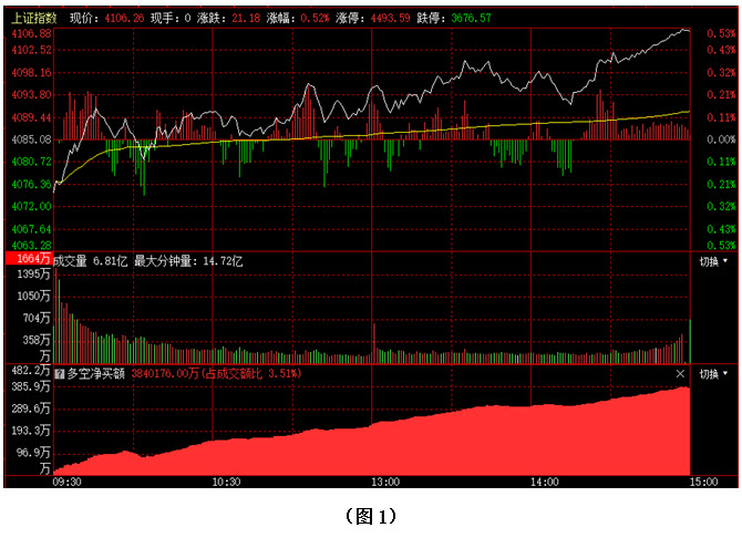 如图1所示,今日早间大盘虽小幅低开,但市场很快就出现反弹,指数回升至昨日收盘点位上方,并继续向上拉升,逐步逼近4100点整数关口,午后大盘走势依然较强,市场重心持续抬高,临近尾盘时指数终于突破4100点整数关口,最终以4106点收盘。从下方的多空资金来看,早间开盘后,多方就占据优势,随后资金持续流入,空方几乎没有进行任何反击。可见今日资金进场十分坚决,多方力量远远强于空方,具备着压倒性优势。所以盘中行情的每一次回探都被多方快速化解,根本无法造成大规模恐慌。在这种情况下,市场自然就难以出现大幅杀跌,后市很可能会在资金的推动下继续向上攀升。建议大家可在控制好仓位的同时,可积极关注近期有资金连续加仓的板块,并在其中优选个股,择机介入。