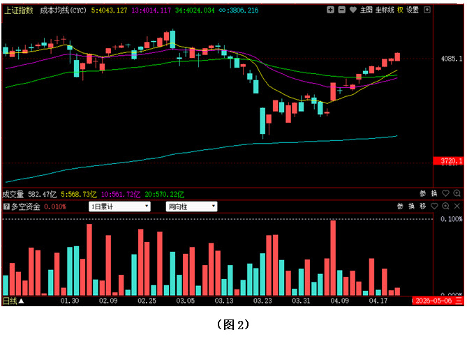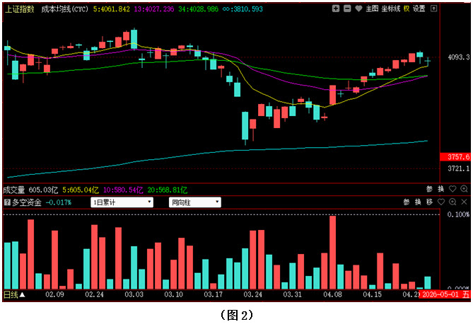 再看图2,今日大盘虽小幅低开,但指数依然完全运行在5日成本均线上方,并进一步上攻,最终夺下4100点整数关口,可见市场短期走势仍处于强势格局当中,接下来只要空方无法连续施压,行情就有望延续现有趋势,继续震荡上行。从下方的多空资金来看,今日多空资金仍为流入状态,且资金流入量较昨日略有增大,说明目前多方力量依然占据着主导地位,但由于大盘刚刚夺回4100整数关口,很多投资者依然较为谨慎,所以资金进场的力度暂时并未大幅增加。在这种情况下,行情在4100点附近很可能还会出现反复,以便确认大盘是否对4100点形成了有效突破。建议大家在控制仓位的同时,密切关注多空资金的进出情况,以便及时掌握行情变化,并做出相应决策。