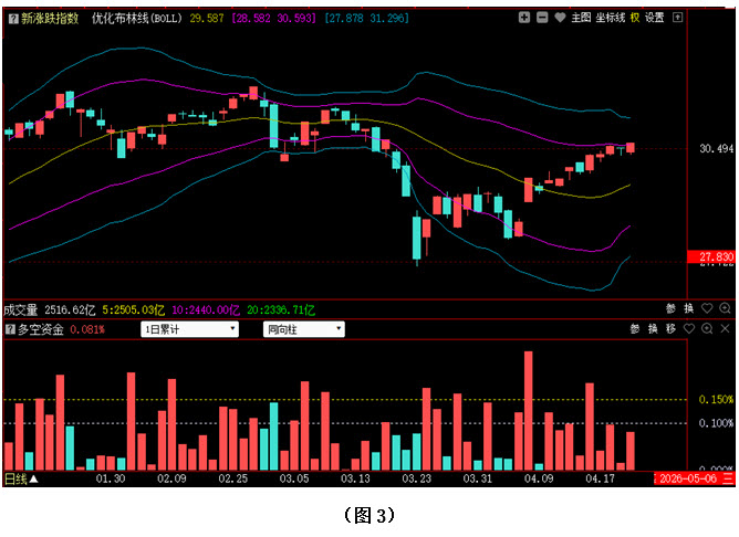 今日两市上涨个股共2658只,其中涨幅超过3%的个股583只,涨幅在9.9%以上的个股85只;下跌个股共2390只,其中跌幅超过3%的个股206只,跌幅在9.9%以上的个股13只。图3所示为指南针特有的0Z指数K线图,从图中可以看到,今日0Z指数同样收出阳线,虽然阳线实体并不是很大,但收盘位置已站到了优化布林上紫线的上方。可见今日场内多数个股都出现了上涨,市场整体走势进一步转强。从下方的多空资金来看,今天多空资金为流入状态,且资金流入量较昨日明显增加,说明今日多方上攻较为坚决,资金积极进场。在这种情况下,空方就难以连续施压,行情出现大幅回落的可能性较小。接下来只要多方继续发力,市场就有望进一步向上攀升。