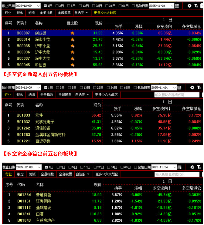 从板块资金动向数据来看,截止到今日收盘时,在资金流入榜上,元件板块以75.98亿的资金流入额位居榜首;其次是光学光电子板块,资金流入48.66亿;此外,通信设备板块、金属非金属新材料板块、百货零售板块也都相继上榜,三个板块的资金流入额分别为35.14亿、17.06亿、11.90亿;再看资金流出榜,普通有色板块引领做空,资金流出45.34亿;其次是证券保险板块,资金流出23.28亿;此外,基础建设板块、白酒板块、主营房地产板块的资金流出额也都相对较多,分列资金流出榜第三到第五名位置。综合比较后可知,今日不仅普通有色板块资金流出超过45亿,证券保险、基础建设、白酒、主营房地产等权重板块也都纷纷出现在资金流出榜前列,对大盘形成明显压制作用;好在多方并没有退缩,元件板块继续大幅做多,资金流入高达74亿,同时光学光电子板块与通信设备板块的资金流入额也都在35亿之上,有效的维持住了场内的多方人气。从六大战区的情况分别来看,截止到今日收盘时,沪中大盘战区与深中大盘战区均为资金流出状态,且两个战区的资金流出额均超过了60亿;其余四个战区则均为资金流入,虽然创业板战区资金流入高达85亿,但其它几个战区的做多力度并不是很强。可见今日空方抛盘主要集中在权重类板块,试图打压指数;多方资金进场则集中在中小盘活跃个股,努力地维持着场内做多人气。而整体上比较,双方力量大体相当,说明在当前位置,行情很可能还会有所反复。建议大家在操作上不要盲目追涨杀跌,可在控制好仓位的同时,关注近期有资金连续流入且短期趋势保持向上的个股,逢低逐步吸纳。