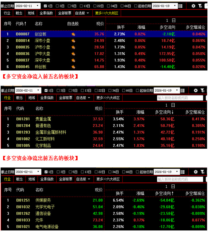 从板块资金动向数据来看,截止到今日午间收盘时,在资金流入榜上,贵重金属板块以58.36亿的资金流入额位居榜首;其次是普通有色板块,资金流入50.79亿;此外,金属非金属新材料板块、化工新材料板块、化学制品板块也都相继上榜,三个板块的资金流入额分别为42.72亿、40.18亿、35.16亿;再看资金流出榜,传媒服务板块引领做空,资金流出54.04亿;其次是光学光电子板块,资金流出29.68亿;此外,通信设备板块、元件板块、电气电源设备板块的资金流出额也都相对较多,分列资金流出榜第三到第五名位置。综合比较后可知,今日上午不仅贵重金属板块与普通有色板块资金流入双双超过50亿,金属非金属新材料、化工新材料、化学制品等板块的资金流入额也都在35亿之上,从而形成了一个新的上攻群体,使得多方人气继续维持在较高水平;反观空方阵营,虽然传媒服务板块资金流出高达54亿,同时光学光电子、通信设备、元件等科技类板块也纷纷出现在资金流出榜前列,但与多方力量相比,整体抛压力仍相对较小。可见今日上午多方力量依然强于空方,资金继续以流入为主。在这种情况下,即便行情出现反复,回探的幅度也将十分有限,预计后市或有继续向上攀升的可能。建议大家积极关注近期有资金连续流入且短期趋势保持向上的个股,逢低吸纳。