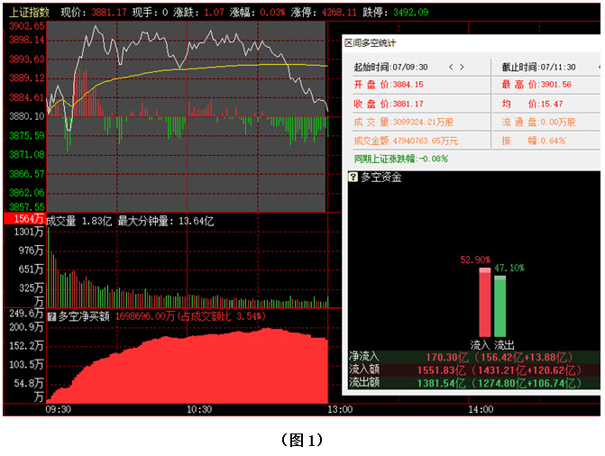 从板块资金动向数据来看,截止到今日午间收盘时,在资金流入榜上,元件板块以47.49亿的资金流入额位居榜首;其次是化学制品板块,资金流入29.85亿;此外,计算机设备板块、化工新材料板块、公共事业板块也都相继上榜,三个板块的资金流入额分别为23.08亿、20.07亿、19.18亿;再看资金流出榜,光学光电子板块引领做空,资金流出18.08亿;其次是银行板块,资金流出5.06亿;此外,白酒板块、航空军工板块、黄金板块的资金流出额也都相对较多,分列资金流出榜第三到第五名位置。综合比较后可知,今日上午不仅元件板块资金流入超过45亿,化学制品、计算机设备、化工新材料等板块的资金流入额也都在20亿之上,场内多方人气相对较高;反观空方阵营,虽然光学光电子板块资金流出达到18亿,但其余板块的资金流出额均不足6亿,与多方力量相比,整体抛压不大。可见今日上午资金以流入为主,多方力量明显强于空方,说明在当前位置有资金尝试进场抄底,有利于行情的逐步企稳。但需要注意的是,如果抄底资金进场后,大盘仍迟迟不见起色,很多投资者就不会选择跟进,从而导致多方后续力量不足,市场再次出现下探。故此建议大家仍要注意控制好仓位,同时密切关注多空资金的进出变化以及3900点整数关口对大盘的压制情况,若多方资金连续进场,指数轻松突破3900点,则可跟随资金,适当加仓;反之,操作上仍需谨慎。