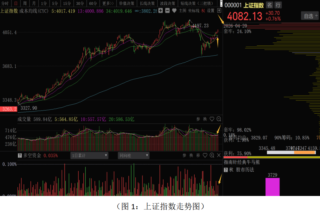 从上证指数来看,股指继续强势上涨,逼近4100点整数大关,成交量小幅放大,多空资金净流入248.91亿元,主力进场积极性有所提升。目前股指站稳4000点大关和中短期成本均线,短期走势强势。波段趋势上,接下来技术压力位在前期平台和筹码密集峰位置,4100点—4200点一带。目前市场运行的内外部条件总体向好,支持市场继续向上运行和修复。外部环境下,尽管中东局势仍有反复,但是市场已经表现出明显的“脱敏”特征。目前中东局势的演绎,对市场影响更多是短暂的情绪面,即使后续双方“边打边谈”,对市场影响逐步减弱,除非军事行动进一步升级。市场整体已经回归到国内基本面上,一季度GDP增速达到5%,超出市场预期,经济增速“开门红”为资本市场的稳定和牛市的继续运行提供了重要的基本面支撑。虽然消费、投资等数据尚不稳固,但月底即将召开的中央政治局会议对经济发展会有进一步的定调和部署,叠加管理层对资本市场制度改革的推进,以及支持中长线资金的入市,市场生态进一步向好,中期慢牛格局会继续。从优化布林线来看,股指站上中上轨位置,走势属于强势,如果触及或上穿上轨位置,短线技术上或表现出“超买”状态,有震荡的可能,所以,短线仍有向上修复的技术空间,近期密切关注美伊谈判的进程,如果能够有较好的谈判成果,行情有突破3800点—4200点箱体进一步向上拓展空间。相反,如果美伊谈判再出现波折,叠加年报、一季报业绩的公布阶段,股指可能在4100点一带会有震荡,等政策面和外部消息明朗后再向上突破。从0Z指数走势来看,昨日股指继续强势上涨,多空资金净流入722.74亿元,相比上周五多空资金流入量再度抬升。70个板块中64个板块上涨,上涨个股家数明显多于下跌个股家数,市场维持一定的赚钱效应。股指连续上涨之后,即将面临筹码密集峰和前期高点的压力,技术上将面临连续上涨累积的获利盘和上方解套盘的抛压,密切关注关键位置的主力资金流向,防止关键位置短线出现震荡的可能。从波段结构牛指标组来看:熊股数量处于连续下降的状态,马股和牛股数量稳步抬升,一方面说明前期调整充分或低位品种机会较大,另一方面部分个股由反弹转为反转。近期操作应采继续采取稳中有进的策略应对,总仓位控制在6成左右,底仓持股为主;短线仓位积极把握结构性机会,部分品种应趁反弹根据关键位置资金流向和短线决策信号做好仓位调整。
